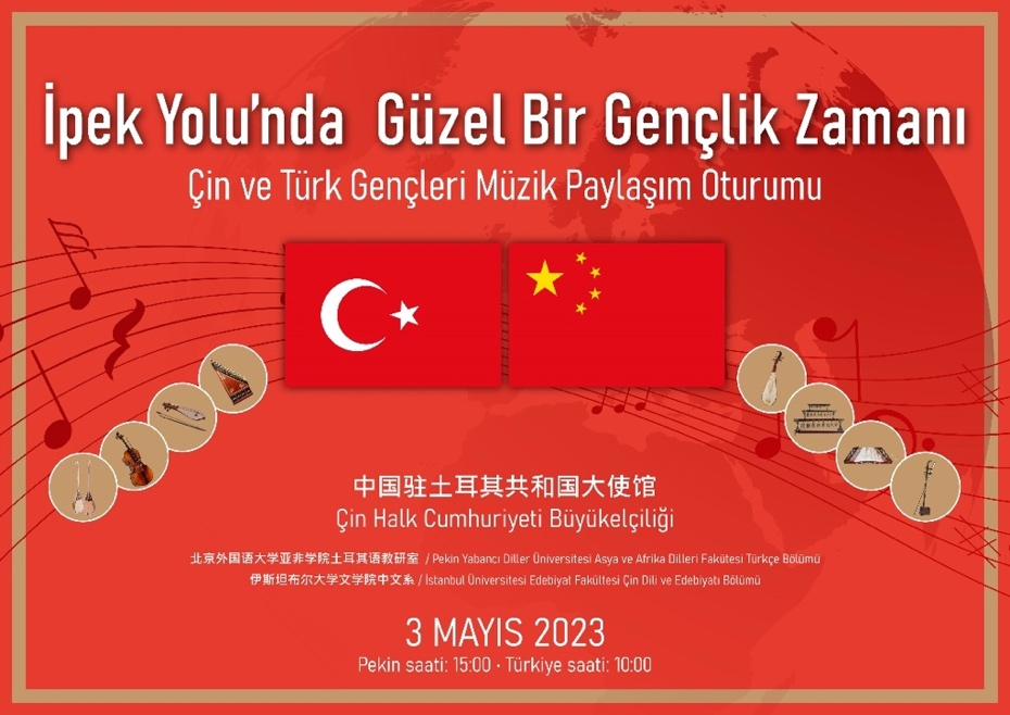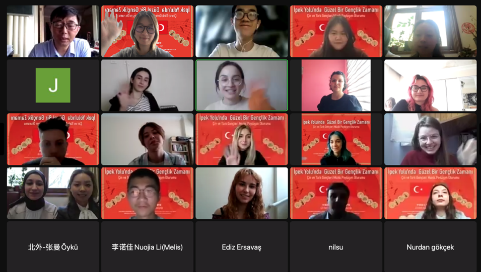 为庆祝“一带一路”倡议提出十周年,落实习近平总书记提出的全球文明倡议,在五四青年节前夕,中国驻土耳其大使馆举办丝路韶华—中土青年音乐分享会,北外BV伟德官方网站土耳其语专业师生同土耳其伊斯坦布尔大学中文系师生代表共同参加此次线上交流活动。