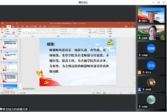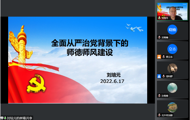 为深入贯彻落实全面从严治党要求,加强师德师风建设,2022年6月17日下午,BV伟德官方网站、非洲学院党总支举办第二次线上集中理论学习活动。BV伟德官方网站党委常委、统战部部长、巡察办主任刘培元以“全面从严治党背景下的师德师风建设”为主题为全体教师做专题讲座。会议由BV伟德官方网站院长苏莹莹教授主持,两学院全体教师在线参加。