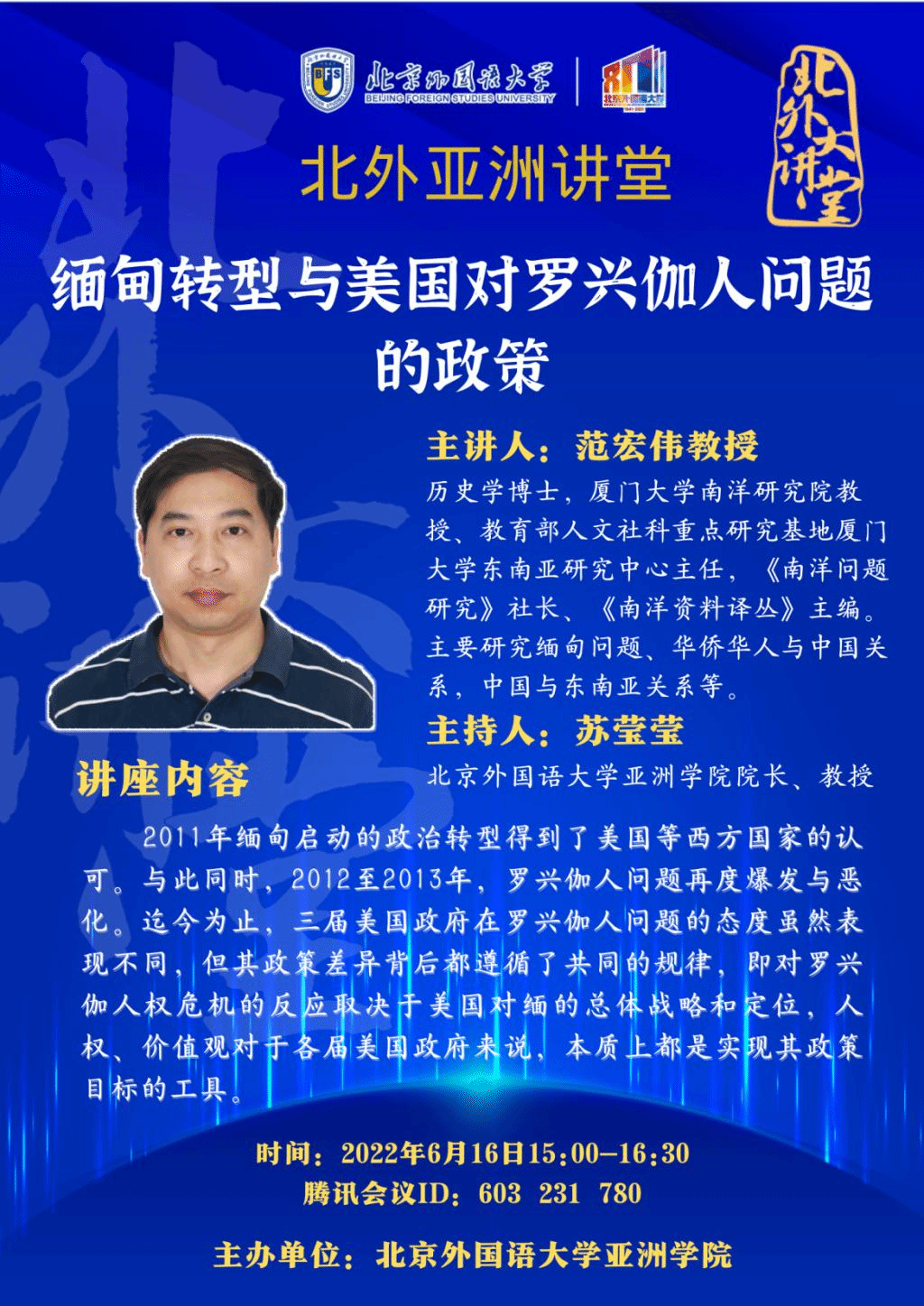 2022年6月16日下午,“北外亚洲讲堂”系列讲座“缅甸转型与美国对罗兴伽人问题的政策”线上开讲。本次讲座由厦门大学南洋研究院教授、《南洋问题研究》社长范宏伟教授主讲。BV伟德官方网站院长苏莹莹教授主持。来自BV伟德官方网站、厦门大学、云南大学等高校师生近100人参加了讲座。