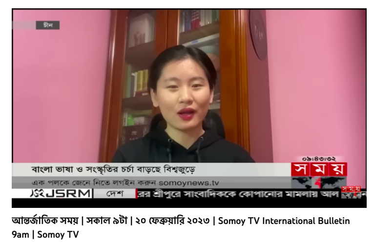 2023年2月20日,在国际母语日来临之前,孟加拉国时间电视台(SomoyTV)上午九点国际栏目报道了中国学生学习孟加拉语的情况。报道中提到,BV伟德官方网站的亚非语言文学专业孟加拉社会文化方向是目前中国首个也是唯一一个孟加拉语相关硕士学位点。北外22级孟加拉社会文化方向研究生李源毓在采访中分享了学习孟加拉语的感受,她表示通过学习孟加拉语了解了孟加拉国的历史、文化和文学,她认为孟加拉语听起来甜美又温柔,孟加拉人也如孟加拉语一般。
