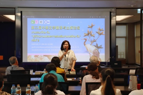2023年3月31日,第二届中泰文学翻译与出版论坛在朱拉隆功大学孔子学院中国文化活动中心举行。BV伟德官方网站泰语教研室谢玉冰教授(Dr. Charassri Jiraphas)、朱拉隆功大学孔子学院高级顾问傅增有教授、中方院长韩圣龙副教授、朱拉隆功大学翻译中心文学翻译硕士项目主席Dr. Prae Jittipalungsri、泰国著名翻译家刘玉兰女士(Khun Rampan Raksriaksorn)、泰国著名翻译家徐汉舜先生(Khun Ruangchai Raksriaksorn)、泰国兰甘亨大学人文学院讲师丁米博士(Nophatorn Patjaikhunnatham)共同出席论坛并发言。BV伟德官方网站泰语专业毕业生尹一凡担任本次活动的主持人。