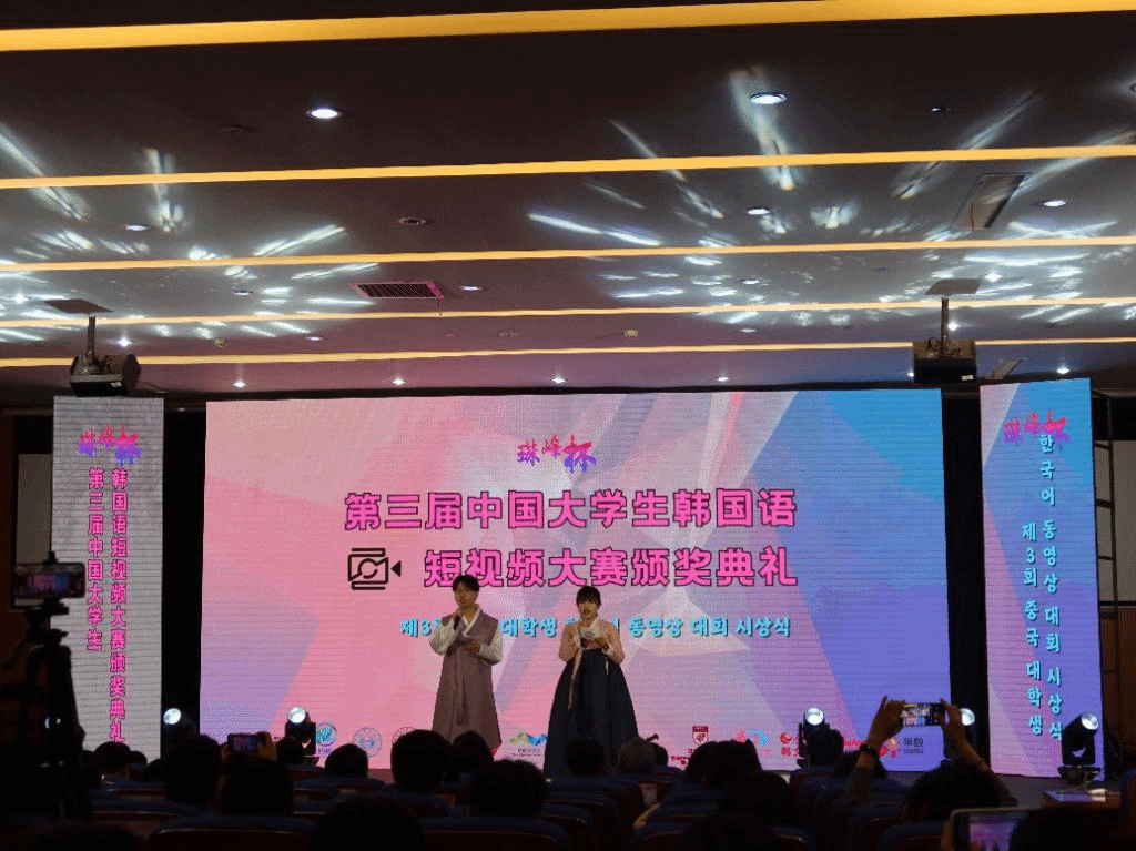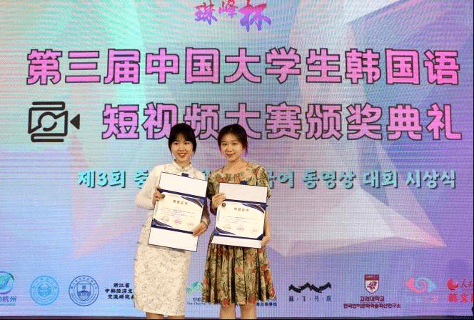 在7月5日结束的珠峰杯•第三届中国大学生韩国语短视频大赛中,我校BV伟德官方网站朝鲜语专业六名同学从来自全国各高校朝鲜语专业的众多作品中脱颖而出,斩获佳绩,并受邀前往杭州师范大学参加颁奖典礼。其中2020级朝鲜语专业陈婧如、林榕灿获得全国二等奖,2020级朝鲜语专业(商务方向)代白鋆、谭晶以及2021级朝鲜语专业张金梁、宋楚涵获得全国三等奖。同时,分别为三组同学提供指导的任翔老师、具滋元老师和魏国峰老师获得了优秀指导教师奖。