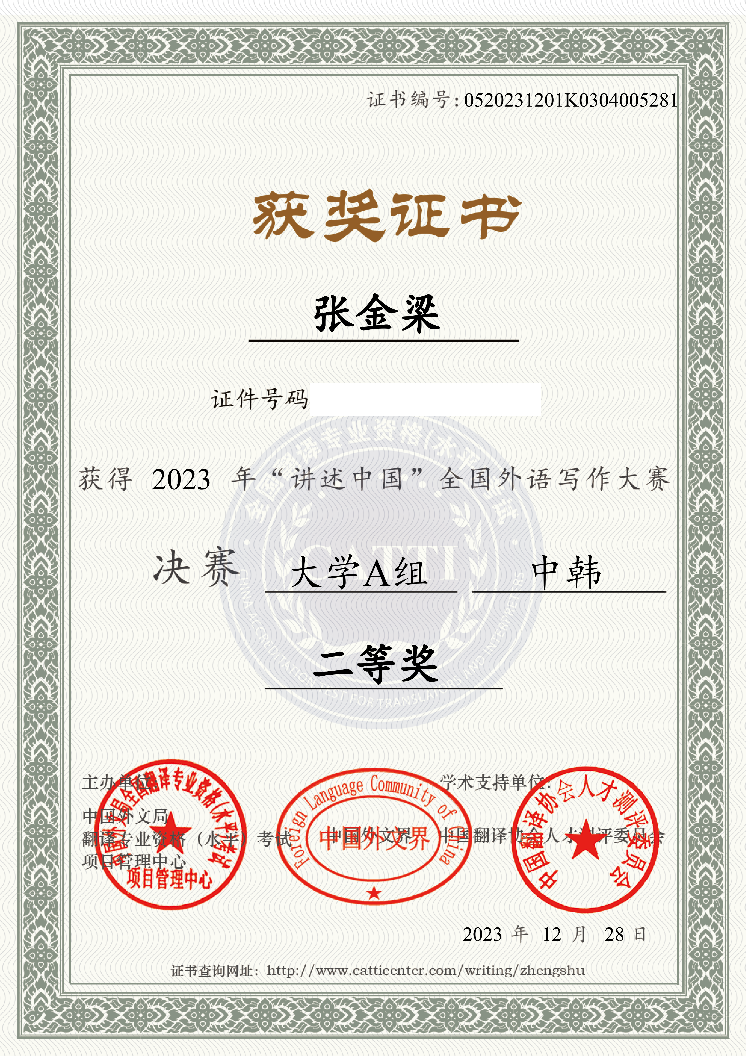 12月28日,我校BV伟德官方网站朝鲜语专业本科学生张金梁在第二届“讲述中国”全国外语写作大赛决赛中荣获二等奖,指导教师安仁焕教授荣获“优秀指导教师奖”。