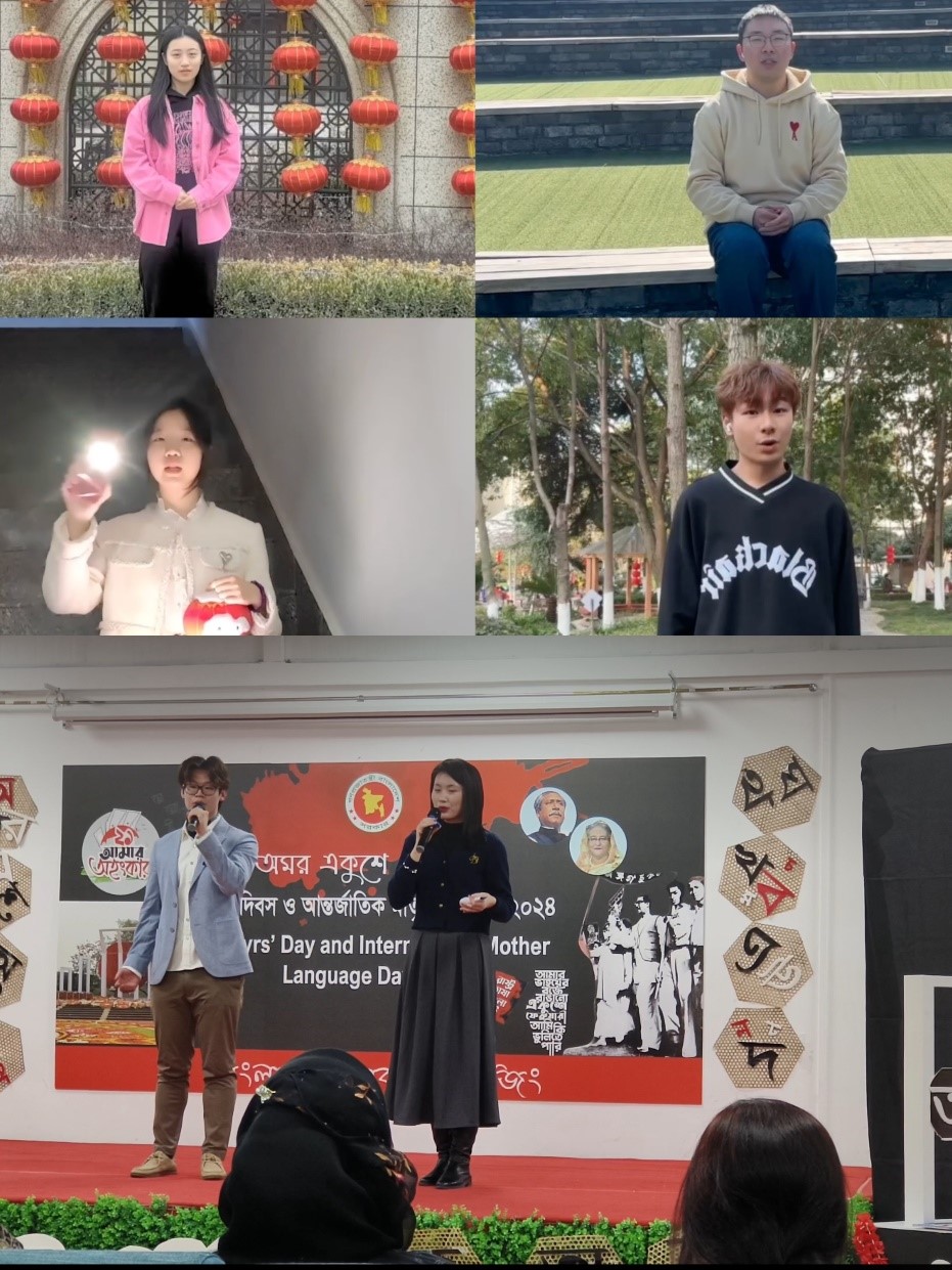 活动中,研究生李源毓和本科生崔洛宾现场朗诵了孟加拉语诗歌《二月之歌》,并演唱了中文歌曲。本科生张千扬、赵澜清、顾韧龙和陈星桥录制了祝福歌曲《他们想了解我们所说的语言》于现场播放。这些节目均获得了与会来宾的高度赞扬与热烈反响。