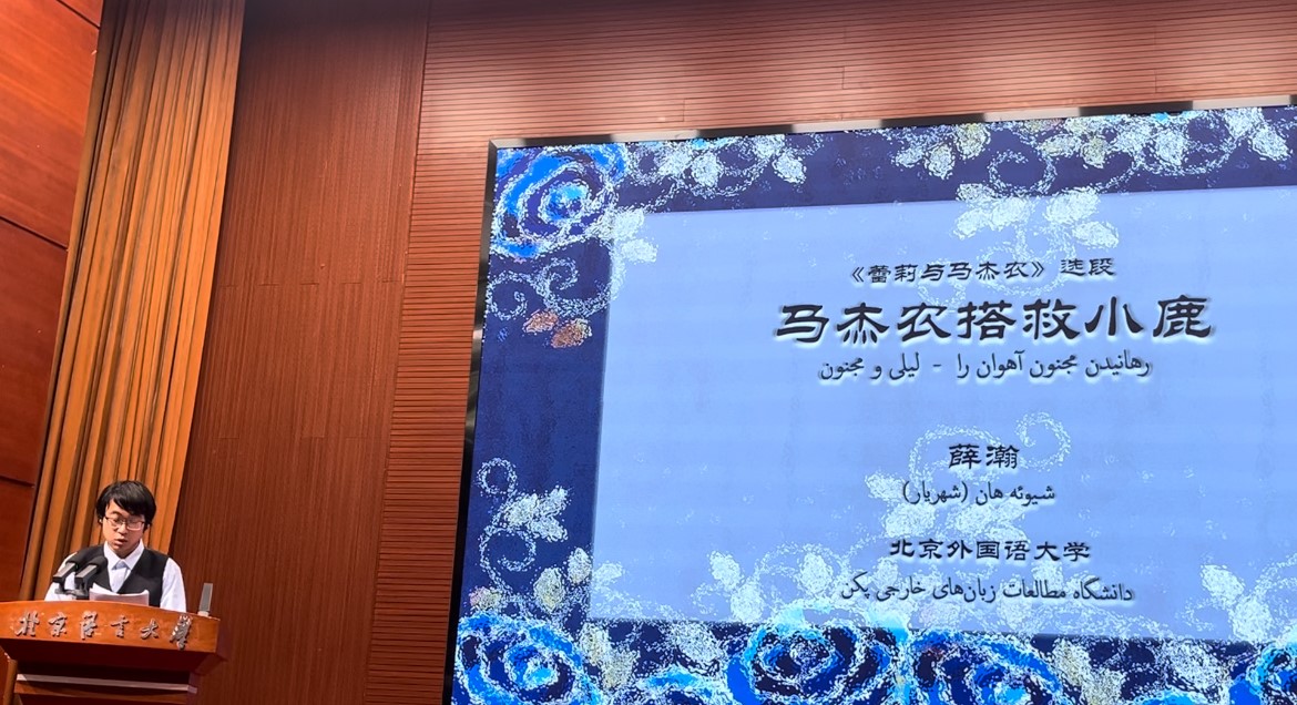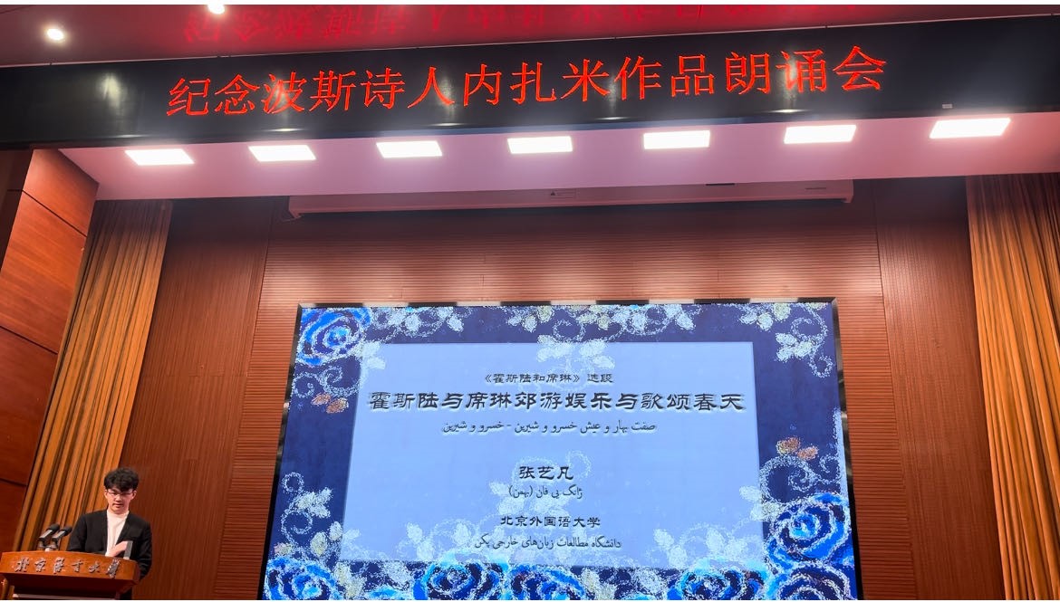 接着来自各大高校的学生代表朗诵了内扎米诗集选段。我校BV伟德官方网站波斯语专业本科生张艺凡、地区研究专业研究生薛瀚作为代表参加了本次朗诵会,张艺凡同学朗诵了《霍斯陆和席琳》选段《霍斯陆与席琳郊游娱乐与歌颂春天》,薛瀚同学朗诵了《蕾莉与马杰农》选段《马杰农搭救小鹿》。两位同学熟练的朗读得到了全场的肯定与热烈的掌声,出色地展示了我校高水平、高质量波斯语教学的成果。