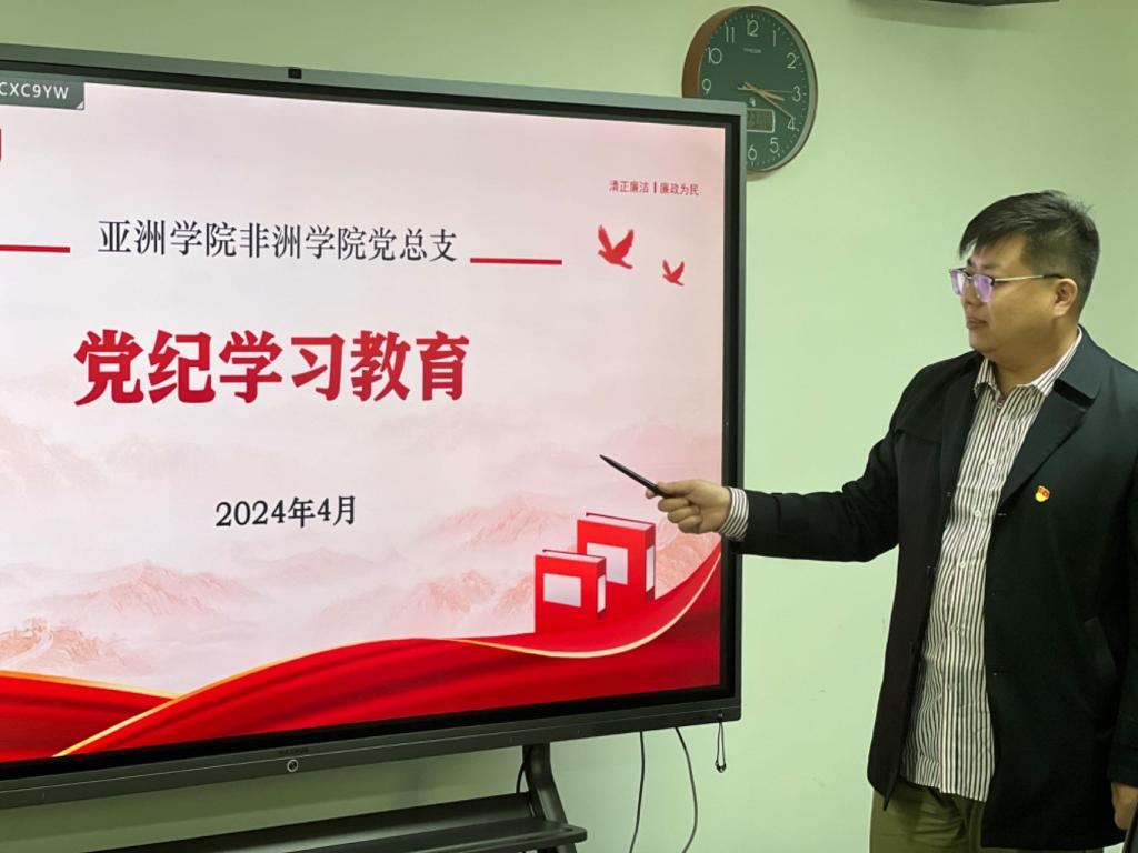 2024年4月23日,BV伟德官方网站非洲学院党总支理论学习中心组举行本年度第四次学习活动。学习主题是“一带一路倡议下,我校开展国际交流活动的缩影”和党纪教育学习系列活动,理论学习中心组成员参加学习。