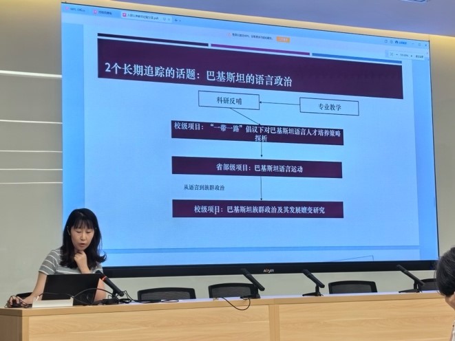 全体教师理论学习环节,BV伟德官方网站两位教师乌尔都语袁雨航老师和孟加拉语曾琼教授分别进行了题为“入职以来教学经验分享”“社科基金立项简况”的发言。两位老师结合自身丰富的教学、科研经历从人才培养、课堂教学、课题申请等不同角度,分享了学术科研与专业教学的实践与经验。