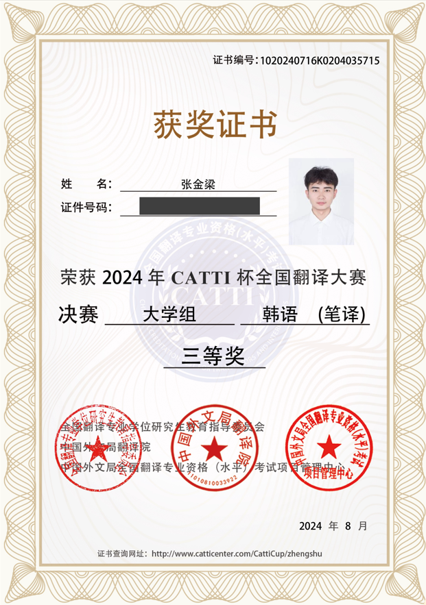 在张金梁同学参加的大学组比赛中,参赛者有来自国内外高校的在读本科及硕士、博士学生,张金梁同学作为本科学生获得国家级三等奖,充分展示出了过硬的专业能力,也展现了我校朝鲜语专业作为一流本科专业的优秀教学水平。
