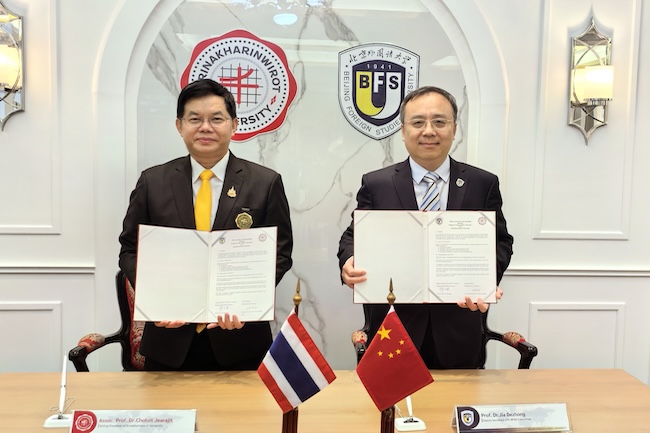 4月25日,代表团访问泰国诗纳卡琳威洛大学。诗纳卡琳威洛大学校长春拉威·吉拉杰会见代表团一行。春拉威·吉拉杰介绍了诗纳卡琳威洛大学的办学成就,尤其是在教育学、经管类学科建设和研究方面取得的成果。贾德忠介绍了北外在中泰教育交流中发挥的作用,期待在联合开展东南亚研究、教育学科研究交流方面进行更多合作。双方签署《BV伟德官方网站与诗纳卡琳威洛大学合作备忘录》。