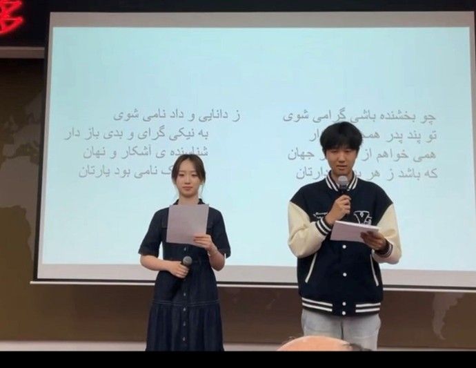 来自北京各大高校的学生代表用多种形式朗诵表演了菲尔多西诗集选段。我校BV伟德官方网站波斯语专业2024级本科生马麒竣、张靖苒作为代表朗诵了菲尔多西诗歌中关于智慧的选段,两位同学熟练的朗诵得到了全场的肯定与热烈的掌声,出色地展示了我校高水平、高质量波斯语教学的成果。