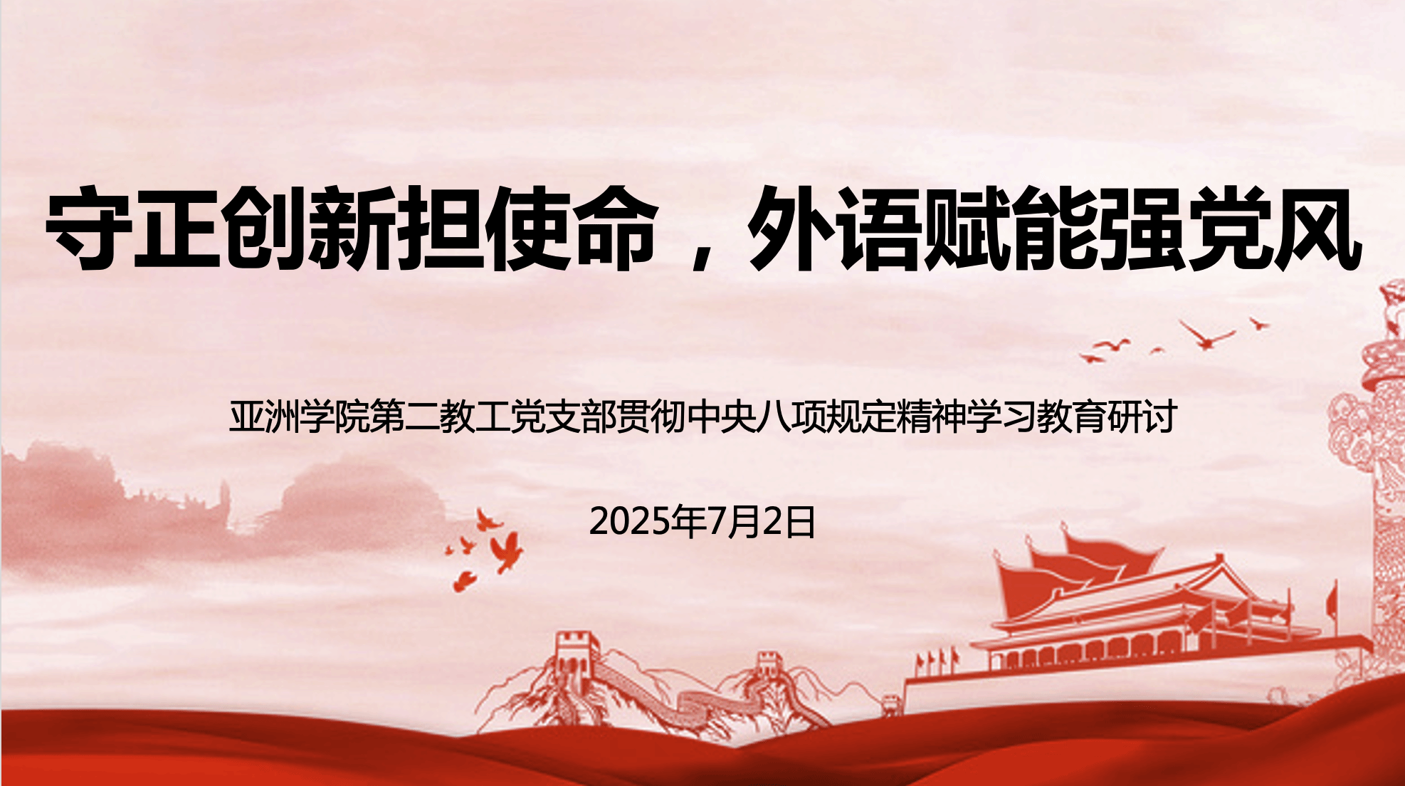 7月2日,BV伟德官方网站第二教工党支部围绕“守正创新担使命,外语赋能强党风”主题开展贯彻中央八项规定精神学习研讨活动。本次活动在7月1日“同上一堂课”活动之后,与会党员结合自身工作实际,充分交流、积极发言,畅谈学习体会,交流思想认识。活动由支部书记曾琼主持。